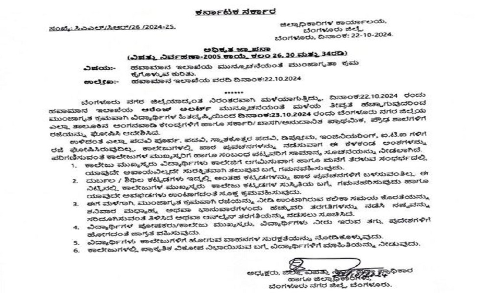 ಬೆಂಗಳೂರು : ಬೆಂಗಳೂರು ನಗರ ಜಿಲ್ಲೆಯಾದ್ಯಂತ ನಿರಂತರವಾಗಿ ಮಳೆಯಾಗುತ್ತಿದ್ದು, ಇಂದು ದಿನಾಂಕ 23.10.2024 ರಂದು ಮುಂಜಾಗೃತ ಕ್ರಮವಾಗಿ ಹಾಗೂ ವಿದ್ಯಾರ್ಥಿಗಳ ಹಿತದೃಷ್ಟಿಯಿಂದ ಬೆಂಗಳೂರು ನಗರ ಜಿಲ್ಲೆಯ ಎಲ್ಲಾ ತಾಲೂಕಿನ ಅಂಗನವಾಡಿ ಕೇಂದ್ರಗಳಿಗೆ ಹಾಗೂ ಖಾಸಗೀ / ಅನುದಾನಿತ ಪ್ರಾಥಮಿಕ, ಪ್ರೌಢಶಾಲೆಗಳಿಗೆ ರಜೆಯನ್ನು ಘೋಷಿಸಿ ಬೆಂಗಳೂರು ನಗರ ಜಿಲ್ಲಾಧಿಕಾರಿ ಜಿ ಜಗದೀಶ ಅವರು ಆದೇಶಿಸಿದ್ದಾರೆ.