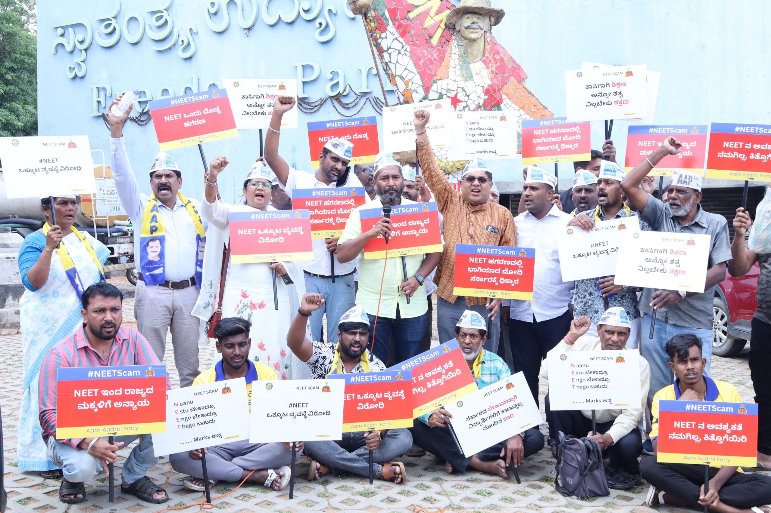 ನೀಟ್ ಹಗರಣದ ವಿರುದ್ಧ ಆಮ್ ಆದ್ಮಿ ಪಾರ್ಟಿ ನಗರದ ಫ್ರೀಡಂ ಪಾರ್ಕ್ನಲ್ಲಿ ಬೃಹತ್ ಪ್ರತಿಭಟನೆ ಹಮ್ಮಿಕೊಳ್ಳಲಾಗಿತ್ತು. ಈ ವೇಳೆ ಮಾತನಾಡಿದ ಆಮ್ ಆದ್ಮಿ ಪಾರ್ಟಿ ರಾಜ್ಯ ಸಂಘಟನಾ ಕಾರ್ಯದರ್ಶಿ ಮೋಹನ್ ದಾಸರಿ, ಕಳೆದ ಐದಾರು ವರ್ಷದಲ್ಲಿ ನೀಟ್ನಲ್ಲಿ ಒಬ್ಬರು ಅಥವಾ ಇಬ್ಬರು ಮಾತ್ರ ಮೊದಲ ರ್ಯಾಂಕ್ ಪಡೆಯುತ್ತಿದ್ದರೆ ಈ ಬಾರಿ 67 ವಿದ್ಯಾರ್ಥಿಗಳು 720ಕ್ಕೆ 720 ಅಂಕ ಪಡೆದಿದ್ದಾರೆ. ಈ ಬಾರಿ ಪರೀಕ್ಷೆಯಲ್ಲಿ ಅಕ್ರಮ ನಡೆದಿದೆ ಎನ್ನುವದಕ್ಕೆ ಇದಕ್ಕಿಂತ ಸಾಕ್ಷಿ ಬೇಕಾ ಎಂದರು.
