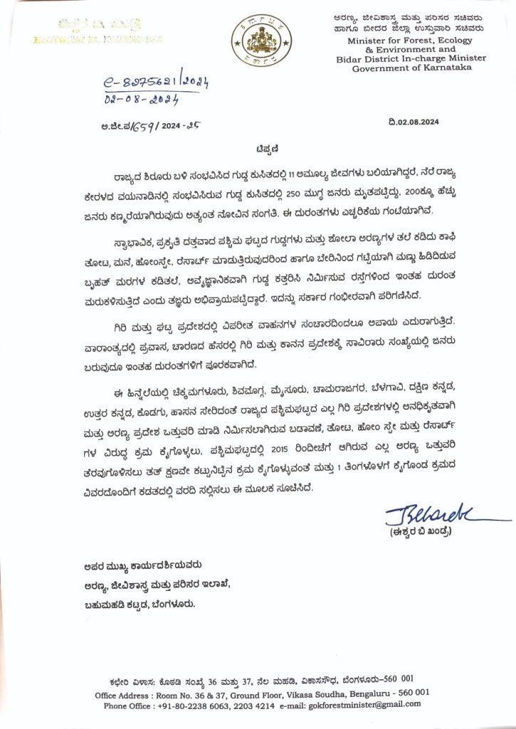 ಈ ಸಂಬಂಧ ಇಲಾಖೆಯ ಅಪರ ಮುಖ್ಯ ಕಾರ್ಯದರ್ಶಿಗಳಿಗೆ ಸೂಚನೆ ನೀಡಿರುವ ಸಚಿವರು, ಪಶ್ಚಿಮ ಘಟ್ಟದ ಎಲ್ಲ ಗಿರಿ ಪ್ರದೇಶಗಳಲ್ಲಿ ಅನಧಿಕೃತವಾಗಿ ಮತ್ತು ಅರಣ್ಯ ಪ್ರದೇಶ ಒತ್ತುವರಿ ಮಾಡಿ ನಿರ್ಮಿಸಲಾಗಿರುವ ಬಡಾವಣೆ, ತೋಟ, ಹೋಂ ಸ್ಟೇ ಮತ್ತು ರೆಸಾರ್ಟ್ ಗಳ ವಿರುದ್ಧ ಕ್ರಮ ಕೈಗೊಳ್ಳಲು, ಮತ್ತು ಅರಣ್ಯ ಒತ್ತುವರಿಯನ್ನು ತಕ್ಷಣದಿಂದಲೇ ತೆರವುಗೊಳಿಸಲು ಕಟ್ಟುನಿಟ್ಟಿನ ಕ್ರಮ ಕೈಗೊಳ್ಳುವಂತೆ ಮತ್ತು 1 ತಿಂಗಳೊಳಗೆ ಕೈಗೊಂಡ ಕ್ರಮದ ವಿವರದೊಂದಿಗೆ ಕಡತದಲ್ಲಿ ವರದಿ ಸಲ್ಲಿಸುವಂತೆ ಸೂಚಿಸಿದ್ದಾರೆ.