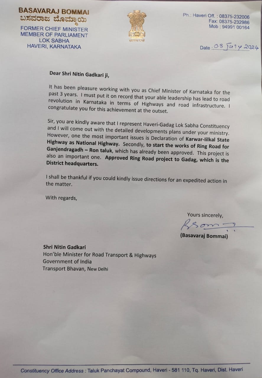 ಕರ್ನಾಟಕದಲ್ಲಿ ರಸ್ತೆ ಹಾಗೂ ಹೆದ್ದಾರಿ ಮೂಲ ಸೌಕರ್ಯ ಅಭಿವೃದ್ದಿಯಲ್ಲಿ ಕ್ರಾಂತಿಕಾರಕ ಬದಲಾವಣೆಯಾಗಿದೆ. ಪ್ರಸ್ತುತ ಇಳಕಲ್ ಕಾರವಾರ ರಾಜ್ಯ ಹೆದ್ದಾರಿಯನ್ನು ರಾಷ್ಟ್ರೀಯನ್ನಾಗಿ ಪರಿವರ್ತಿಸುವುದು, ರೋಣ ತಾಲೂಕಿನ ಗಜೇಂದ್ರಗಢ ರಿಂಗ್ ರಸ್ತೆ ಹಾಗೂ ಗದಗ ರಿಂಗ್ ರಸ್ತೆ ಯೋಜನೆಗಳನ್ನು ಜಾರಿಗೊಳಿಸುವಂತೆ ಮನವಿ ಮಾಡಿದರು.