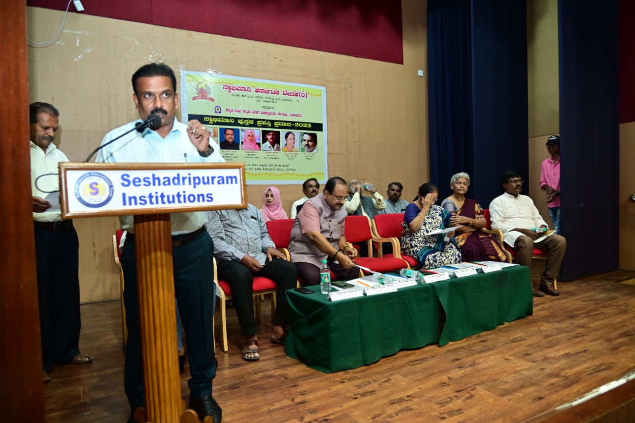 ಸ್ವಾಭಿಮಾನಿ ಕರ್ನಾಟಕ ವೇದಿಕೆ ಮತ್ತು ಶೇಷಾದ್ರಿಪುರಂ ಕಾಲೇಜಿನ ಕನ್ನಡ ವಿಭಾಗದ ಕನ್ನಡ ಸಂಘ ಜಂಟಿಯಾಗಿ ಆಯೋಜಿಸಿದ್ದ ಸ್ವಾಭಿಮಾನಿ ಪುಸ್ತಕ ಪ್ರಶಸ್ತಿ ಮತ್ತು ದತ್ತಿ ಪ್ರಶಸ್ತಿಗಳನ್ನು ವಿತರಿಸಿ ಮಾತನಾಡಿದರು.